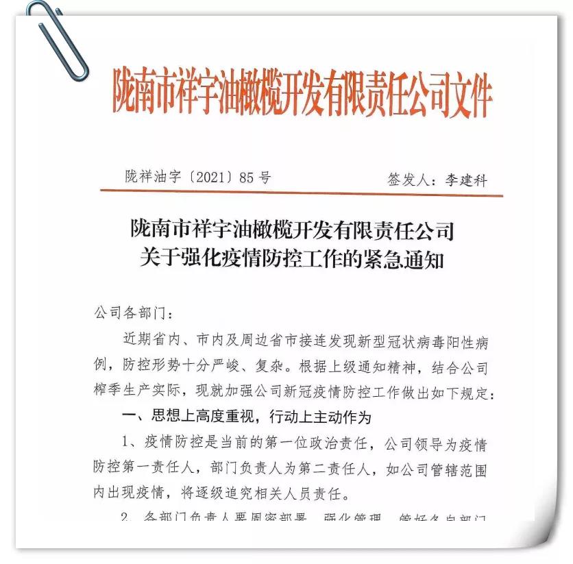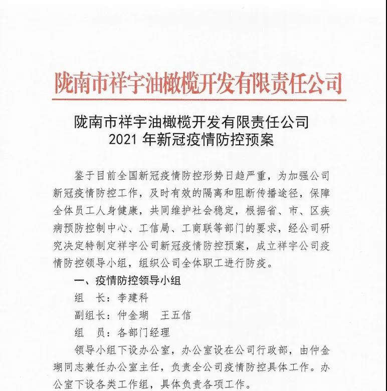 確保今年油橄欖鮮果收購(gòu)工作圓滿(mǎn)完成,隴南市祥宇油橄欖開(kāi)發(fā)有限責(zé)任公司根據(jù)實(shí)際情況及時(shí)成立了疫情防控小組,