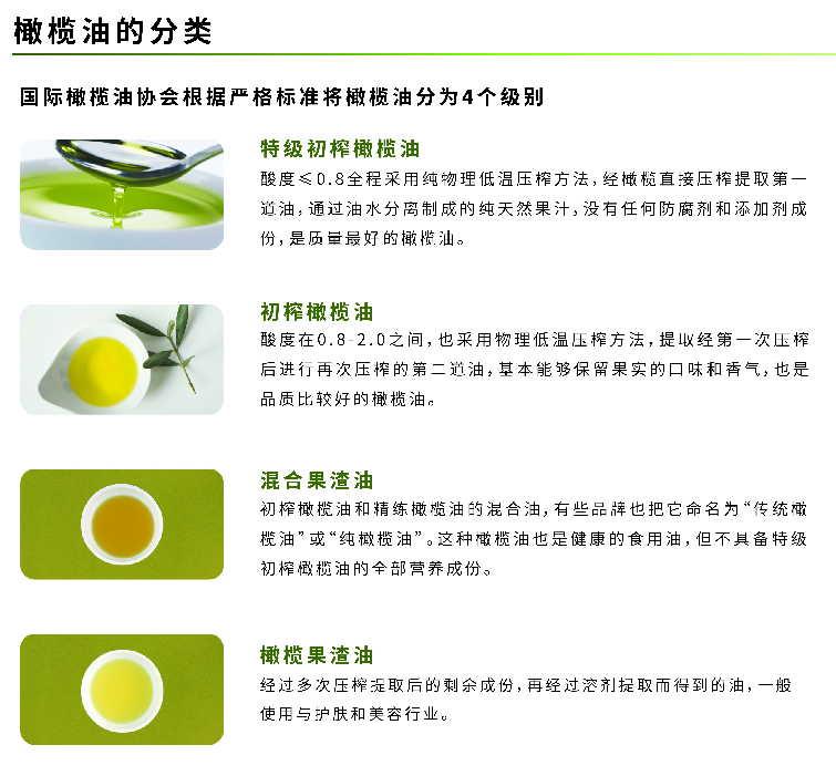 國際橄欖油協(xié)會(huì)根據(jù)嚴(yán)格標(biāo)準(zhǔn)將橄欖油分為4個(gè)級別: